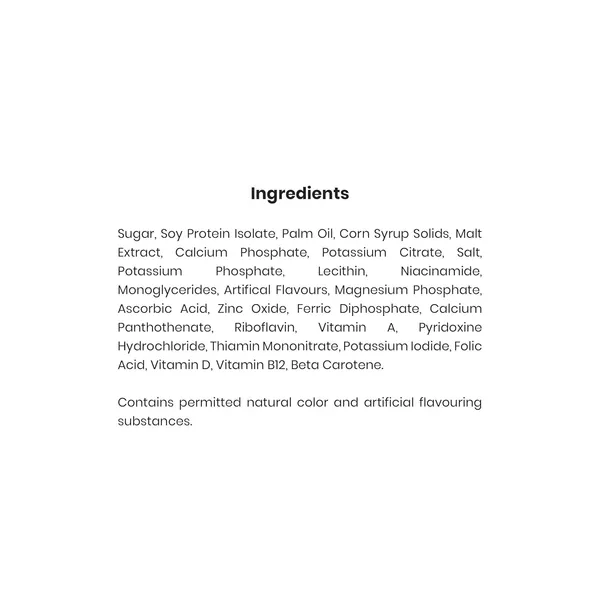 Ingredients: Sugar, Soy Protein Isolate, Palm Oil, Corn Syrup Solids, Malt Extract, Calcium Phosphate, Potassium Citrate, Salt, Potassium Phosphate, Lecithin, Niacinamide, Monoglycerides, Artifical Flavours, Magnesium Phosphate, Ascorbic Acid, Zinc Oxide, Ferric Diphosphate, Calcium Panthothenate, Riboflavin, Vitamin A, Pyridoxine Hydrochloride, Thiamin Mononitrate, Potassium Iodide, Folic Acid, Vitamin D, Vitamin B12, Beta Carotene. Contains Permitted Natural Color And Artificial Flavouring Substances.
