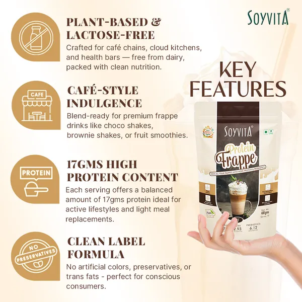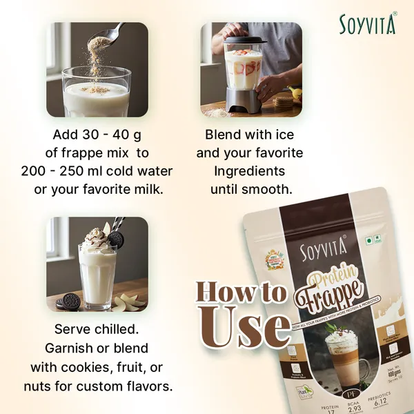 For Those Who Abstain From Milk, Dairy, And Traditional Whey-Based Protein Products, Soyvita Protein Frappe Is The Answer. Elevate Your Daily Nutrition With The Goodness Of Plant-Based Protein, Prebiotic Fibers, And Probiotic Fibers, All While Relishing The Delectable Taste Of Your Favorite Frappe Creations.